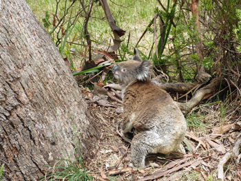 Otway quand une forme arrondie dans les arbres au détour d’un virage signe la présence d’un koala. Nous parcourons cette forêt d’eucalyptus où ils sont si nombreux qu’on ne les compte même plus. Certains dorment tranquillement à 20 mètres de hauteur dans les hautes branches quand, plus loin, une maman et son bébé se câlinent doucement. L’un de ceux que nous observions s’est décidé à changer d’arbre devant nous, descendant doucement et nullement effrayé par notre présence. Titouan aura le temps de lui caresser le dos au passage.