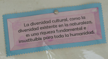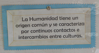 Dans la cour, il y a un panneau sur l’interculturalité avec des messages invitant à prendre en compte les différences culturelles dans la construction d’une humanité pacifique et ouverte sur les autres et leurs différences. La diversité des cultures est comparée à la diversité que l’on rencontre dans la nature, comme une richesse à découvrir plus que comme un obstacle.